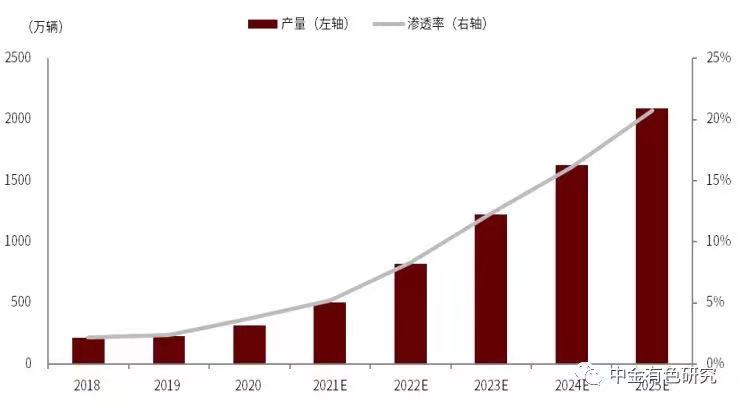 机构预计,截至2025年,全球新能源汽车产量和渗透率将继续大幅走高: