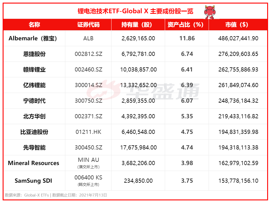 这只ETF遍及锂电池产业链,包括锂采矿,锂精炼和电池生产,今年以来累计涨幅已达27.08%。其成分股包括雅宝(ALB)、赣锋锂业(01772.HK)、宁德时代(300750.SZ)、亿纬锂能(30014.SZ)等。