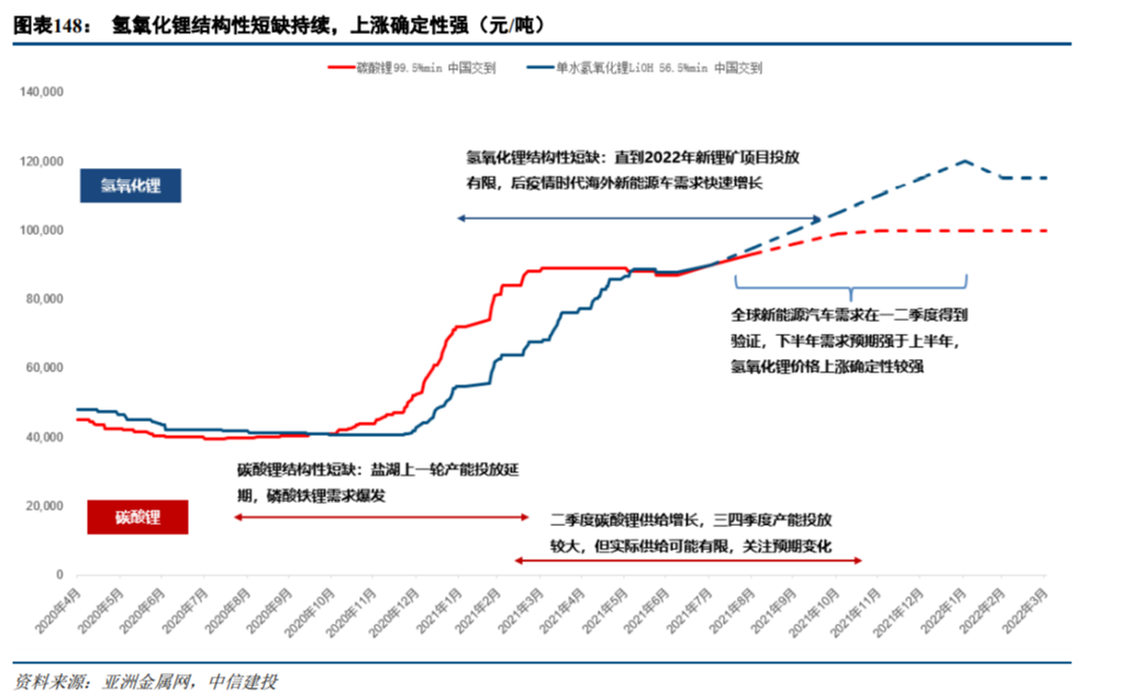 (3)氢氧化锂上行逻辑强化。中金认为结构性供需抽紧将强化氢氧化锂上行逻辑,氢氧化锂主要供应商及具备扩产预期和能力的企业有望实现量价齐升。