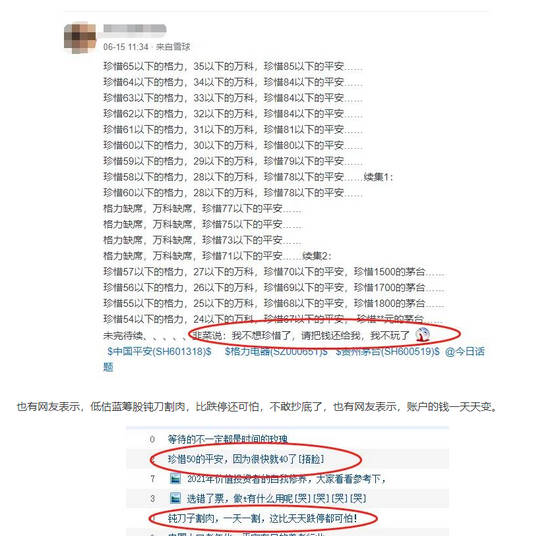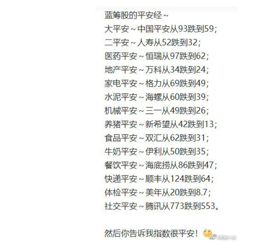 市场上更是给中国平安冠以“ST平安”,刚开始市场呼吁“珍惜65以下的格力,35以下的万科,85以下的平安”,韭菜说,“我不想珍惜了,请把钱还给我,我不想玩了”,还有股民说,“珍惜50的平安吧,因为马上就到40了”。
