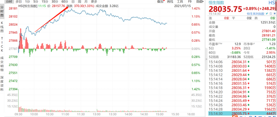 今天率先表演一个是港股,一个是外资。消息面敏感的港股在上午10点以后疯狂抬升港股走势,临近午盘,恒指直接突破28000点。