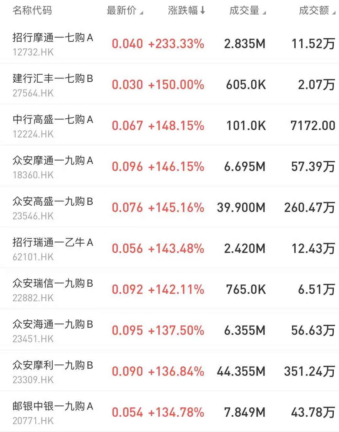 涨幅居前的包括:招商摩通—七购A暴涨233.33%,占据排行榜第一,建行汇丰—七购B涨150%;中行高盛—七购A涨148.15%。