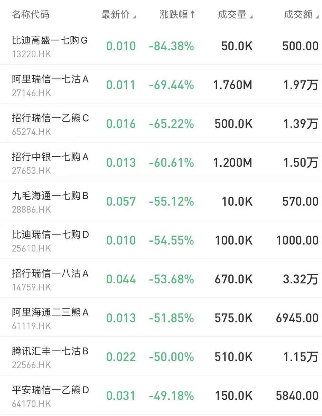 今日所有窝轮牛熊证合计成交187.79亿港元,占大市成交12.43%。