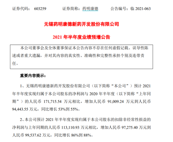 7月15日晚间,药明康德公告,预计2021年半年度实现归属于本公司股东的净利润与上年同期的人民币171,715.54万元相比,增加人民币91,009.24万元到人民币94,443.55万元,同比增长53%到55%。预计2021年半年度实现归属于本公司股东的扣除非经常性损益的净利润与上年同期的人民币113,110.93万元相比,增加人民币97,275.40万元到人民币99,537.62万元,同比增长86%到88%。