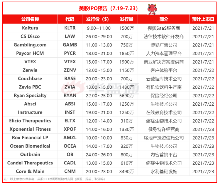 本周预计将有18只新股登陆美股IPO市场,涉及无糖有机软饮饮料、软件开发及生物技术等多个行业,其中多只SaaS概念股在列。