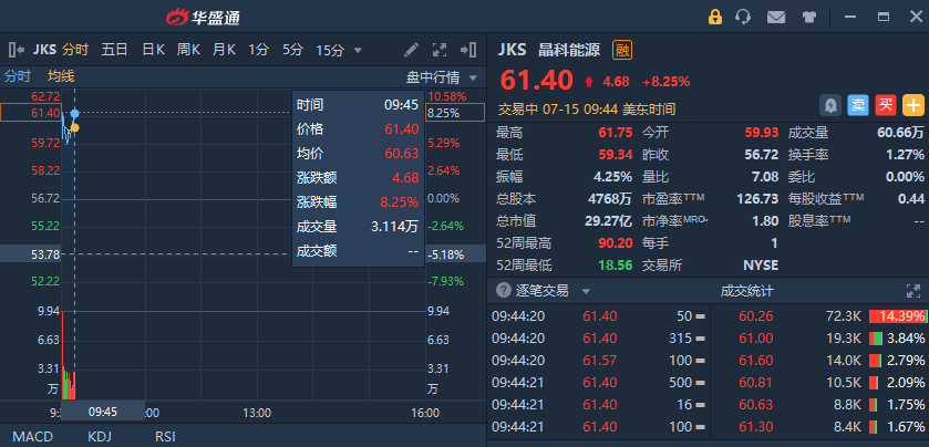 华盛资讯7月15日讯,美股早盘,部分热门中概股走高。截至发稿,晶科能源涨超8%。