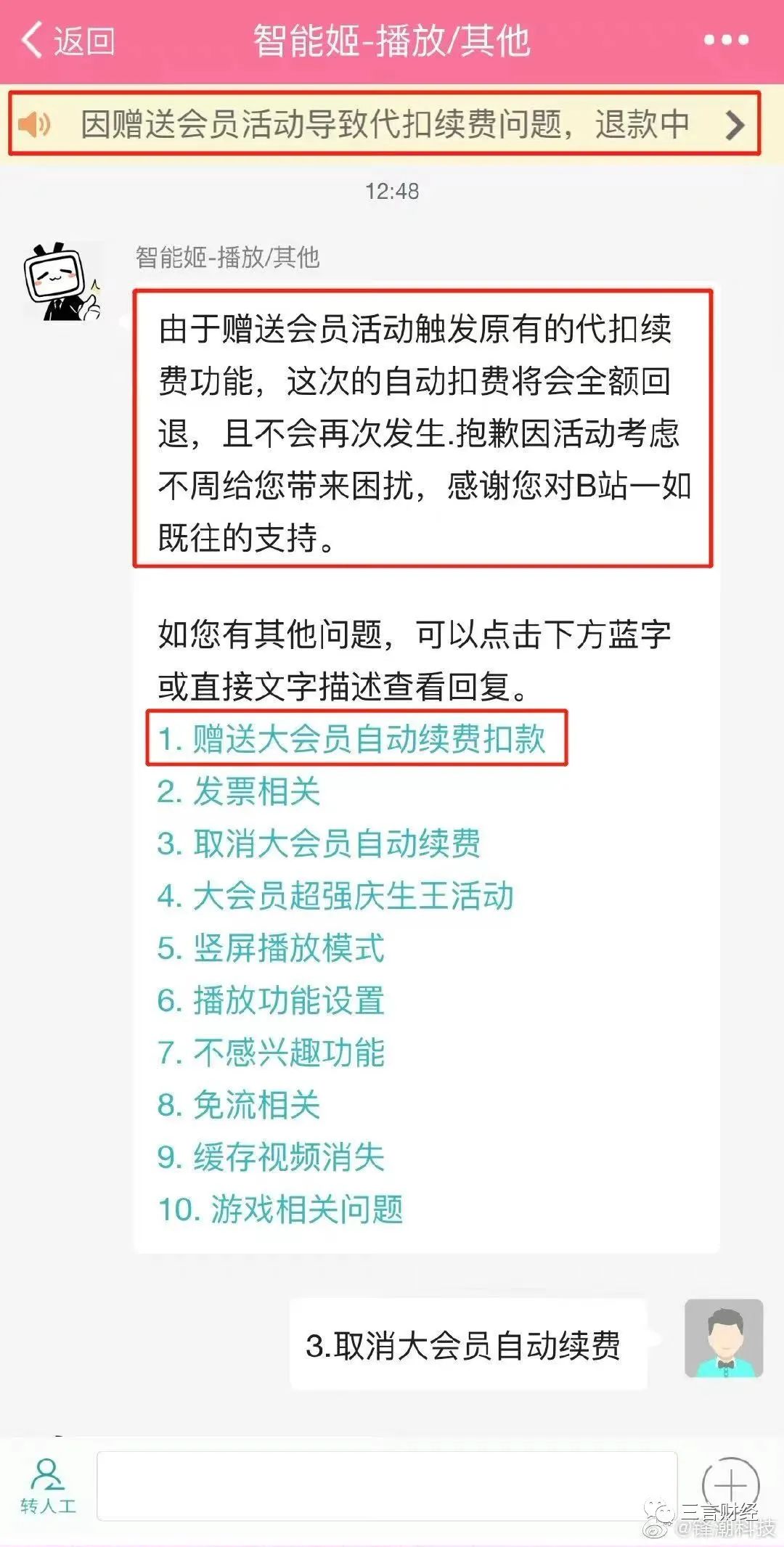 根据一张B站AI客服聊天记录显示,赠送会员服务触发了原有的代扣续费功能,将会为误扣款的用户全额退款。