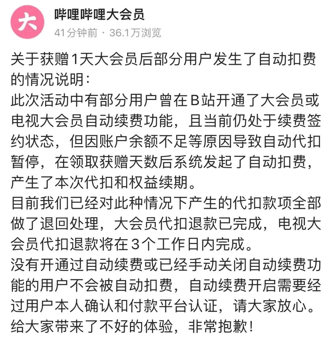具体原因,B站官方进一步解释称,此次活动中有部分用户曾在B站开通了大会员或电视大会员自动续费功能,且当前仍处于续费签约状态,但因账户余额不足等原因导致自动代扣暂停,在领取获赠天数后系统发起了自动扣费,产生了本次代扣和权益续期。