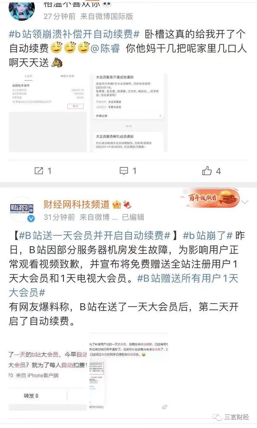 三言财经消息,日前B站因为崩溃向全体用户补偿了一天大会员,不过有部分网友收到补偿后却触发了自动续费的BUG,直接被扣了钱。