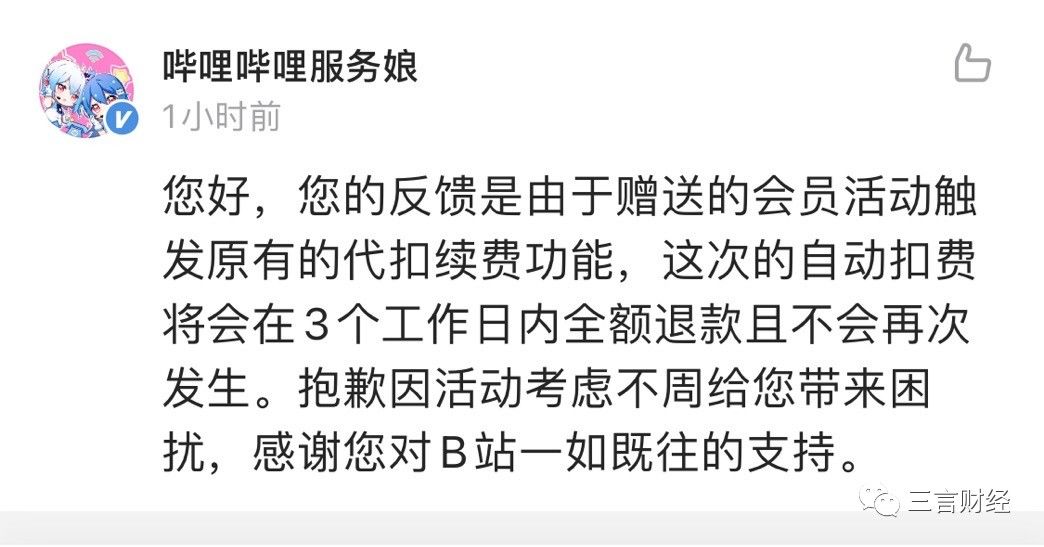 B站方面也确认了触发自动续费问题的原因。B站官方账号回应称,该问题是由于赠送的会员活动触发原有的代扣续费功能。这次的自动扣费将会在3个工作日内全额退款并且不会再次发生。
