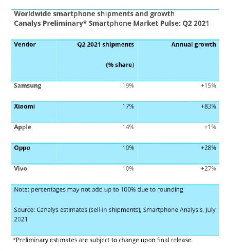 7月15日消息,Canalys发布的最新数据显示,2021年第二季度全球智能手机市占率排名,小米全球智能手机市占率升至17%,超越苹果,首次成为全球第二,同比增长83%,也是市占率前五手机品牌中,增速最快的品牌。