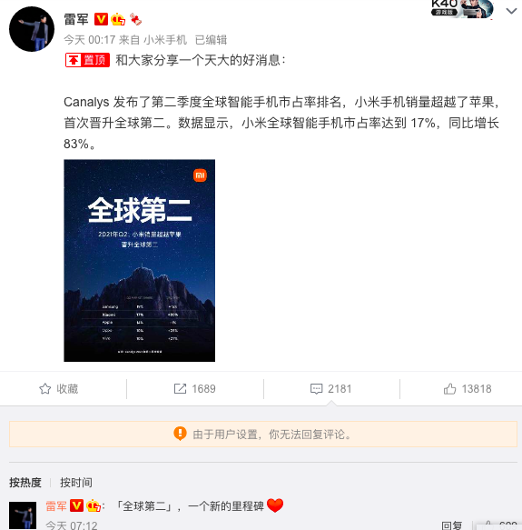 小米创始人雷军在微博“和大家分享一个天大的好消息”,他表示“全球第二”,一个新的里程碑。将继续坚持做“感动人心、价格厚道”的好产品,向着梦想的方向,前进!