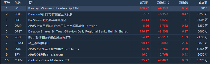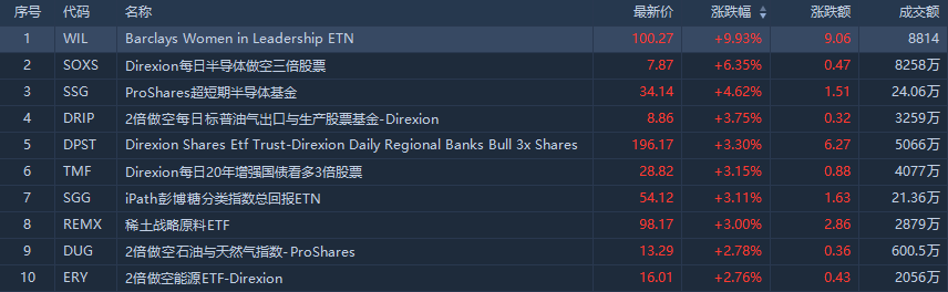 从ETF涨幅榜来看,涨幅居前的有2倍做空每日标普油气出口与生产股票基金ETF涨3.75%,成交额3259万美元;2倍做空石油与天然气指数ETF涨2.78%。