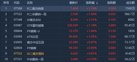 从ETF涨幅榜来看,今日涨幅位居前的ETF有南方两倍看空纳指ETF涨1.74%,成交额是1560万港元;华夏两倍看空纳一百ETF涨1.6%。