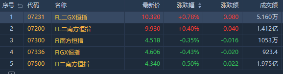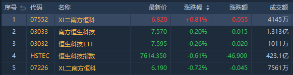 看多恒指相关ETF走弱,南方两倍做多恒科(07226.HK)跌0.72%,成交额约7561万港元;南方恒生科技(03033.HK)跌0.2%,成交额约1.31亿港元;