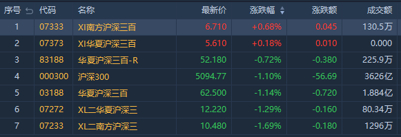 沪深300指数收跌1.1%。其中,华夏沪深三百-R(83188.HK)跌0.72%;华夏沪深三百ETF(03188.HK)跌1.14%,成交额约1.88亿港元。