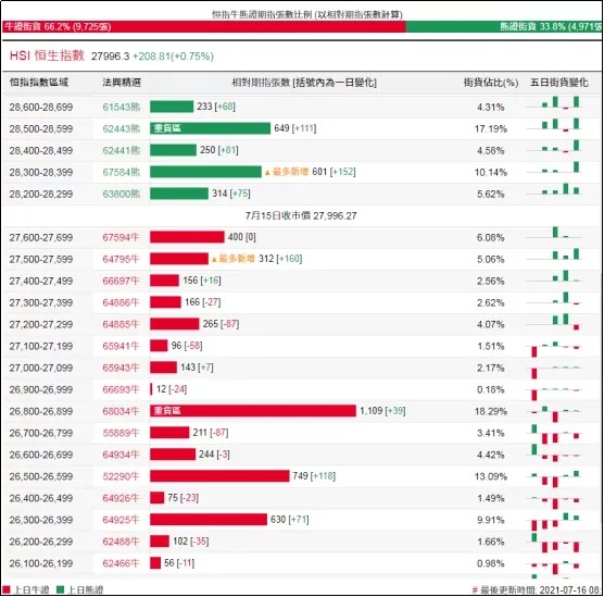 街货分布方面,至周四,恒指牛证街货重货区在收回价26500点至26900点之间,累计相当约2313张期指合约;恒指熊证街货重货区在收回价28200点至28700点之间,累计相当约2047张期指合约。