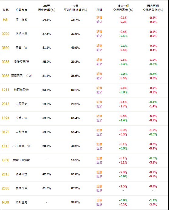周四恒指相关权证的平均引伸波幅约19.7%,按日继续轻微调升。个股方面,美团、港交所、比迪、快手、瑞声科技等相关认购证的引申波幅按日调降显著;相反,美团、阿里、纳斯达克等相关认购证的引申波幅则见按日调升。