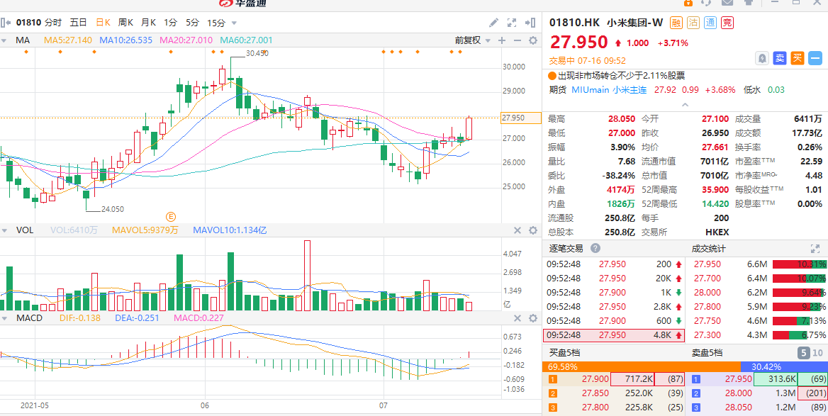今日早盘,小米迅速走高,现涨3.71%,报27.95港元每股,突破所有均线,刷新7月新高,最新总市值7010亿港元。