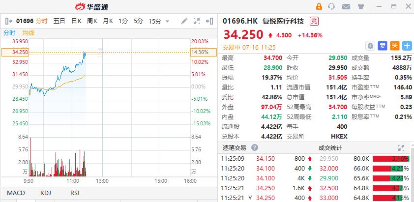 华盛资讯7月16日消息,近日复锐医疗就长效肉毒素产品与复星产业订再许可协议,受消息刺激,复锐医疗近日持续强势上涨,截止发稿,复锐医疗科技上涨14.36%,现报每股34.25港元,总市值151.4亿港元,成交额4888万港元。值得一提的是,该股三日累计涨幅超50%。