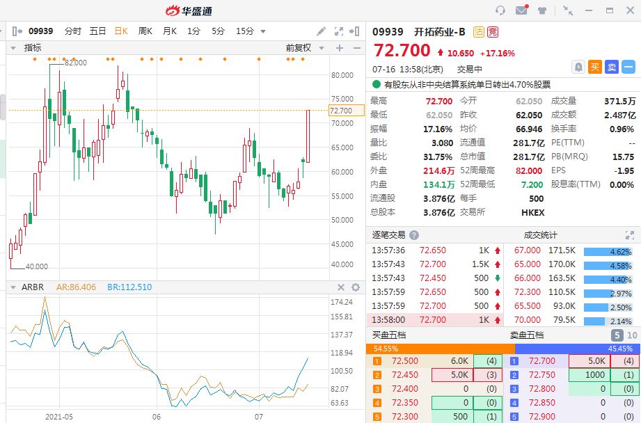 华盛资讯7月16日讯,开拓药业午后一路走高,截至发稿,开拓药业涨17.16%,报72.7港元,成交额为2.487亿港元,市值281亿港元。