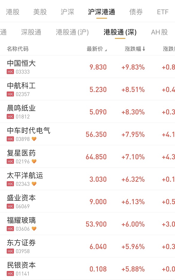 沪深两市成交额连续第12个交易日突破一万亿元。周五午后沪深股市震荡走低,截止发稿,上证指数跌0.51%;深证成指跌0.92%;创业板指跌2.31%。港股通(沪)、港股通(深)个股方面,中国恒大涨9.83%,晨鸣纸业涨8.30%,中车时代电气涨8.14%,复星医药涨7.10%,福耀玻璃涨6.00%。