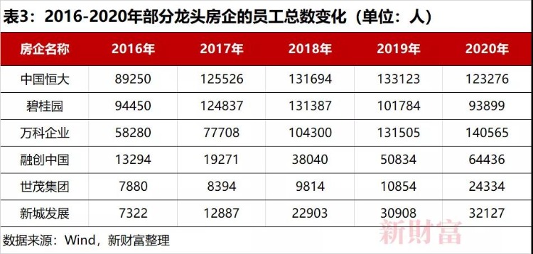 虽说一度同踩“三道红线”,融创中国却无裁员的迹象。相对而言,中国恒大是裁员相对较多的房企之一。除去碧桂园之外,万科企业、世茂集团(00813.HK)、新城发展(01030.HK)2020年底员工则同比有不同程度的增长,队伍规模在扩大。