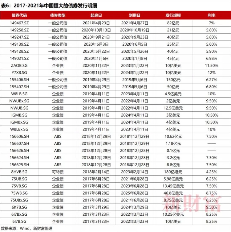 新财富对2017-2021年中国恒大在境内外市场发行的29项债券数据梳理发现,其债券融资涉及一般公司债、企业债、ABS和可转债等产品(表6)。