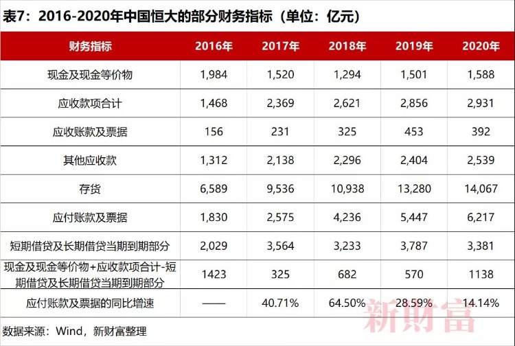Wind数据显示,截至2020年底,中国恒大的现金及现金等价物为1588亿元,同期的“短期借贷及长期借贷当期到期部分”为3381亿元。与短期的偿债规模相比,中国恒大存在1793亿元的现金缺口(表7),由于同期的应收款项合计为2931亿元,倘若期间回款得力,应收款项回款的资金足够填平前述现金缺口,仍有较大空间应对潜在的挑战。当然,其短期现金流压力巨大已是不争的事实。