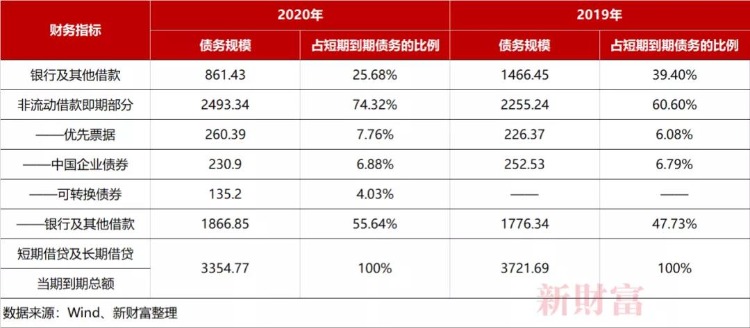 对中国恒大的短债结构做进一步分析,可以发现,2019、2020年,其一年内到期的各种债务总规模分别为3721.69亿元、3354.77亿元,其中,短期借贷及长期借贷当期到期总额为3242.79亿元、2728.28亿元,分别占一年内到期的各种债务总和的87.13%、81.32%(表8)。