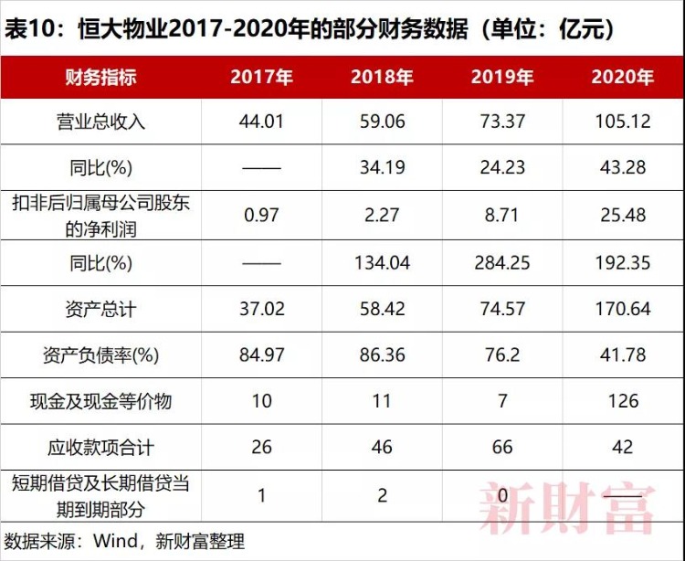 由中国恒大拆分的恒大物业,净资产规模约100亿元,当属恒大集团旗下基本面较为良好的子公司之一。截至2020年底,恒大物业资产负债率仅为41.78%,几乎不存在短债,账上现金充沛;且营业收入和净利润均呈快速增长;营业收入105.12亿元,同比增长43.28%;扣非净利润达25.48亿元,同比增长192.35亿元(表10)。