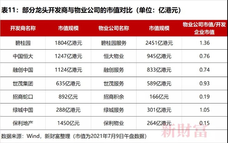 由于房地产进入存量博弈时代,物业管理的价值日渐获得资本市场认可,甚至有物业公司市值已超过开发企业市值,如,碧桂园服务的市值2451亿港元,超过了碧桂园的1804亿港元;绿城服务市值301亿港元,超过绿城中国288亿港元(表11)。