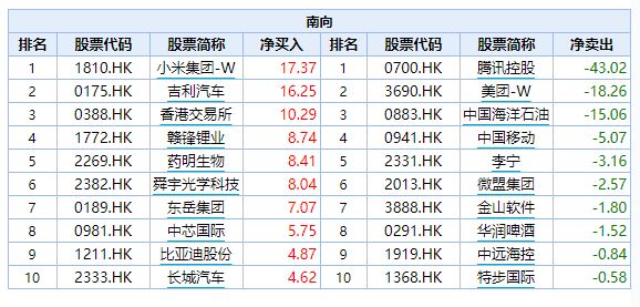 个股资金流向统计:南下资金小米、吉利、赣锋锂业,大量抛售腾讯、美团