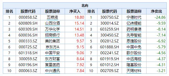 本周北上资金买入金额最多的标的为五粮液,一周净买入18.80亿元。山西汾酒获净买入15.14亿元,万华化学获净买入14.51亿元。招商银行、美的集团、京东方A也获港资加仓。