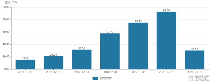 2020年,小米投入的研发费用差不多到了百亿规模,规模在明显提升: