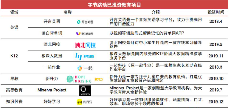 教育领域则是字节跳动近两年力推的新业务,旗下业务横跨pre-k,k12,成人教育多年龄段,涵盖多学科、多课程,软硬件均有探索。此外,字节跳动还参与投资了晓羊教育、新升力、Minerva University、一起作业、极课大数据等教育公司,力求在该领域闯出一片天。