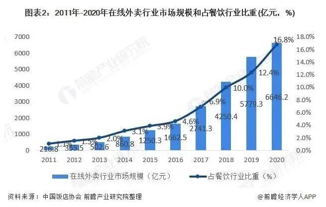 自从外卖这个概念彻底被社会所接受后,它的发展就如同竹子一般只涨不跌,在2011年时外卖行业的市场规模只有216.8亿元,占餐饮行业比重的1.1%,九年后这个数字变成了6646.2亿元和16.8%,增长速度十分夸张。