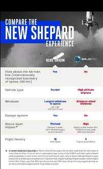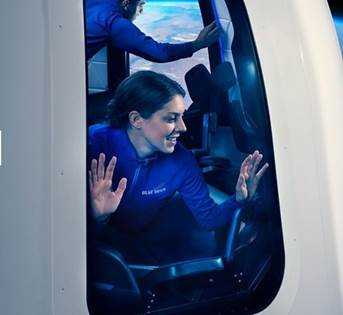 在蓝色起源的太空旅行业务中,将以可搭载六名乘客的New Shepard太空飞船,送上距地面超100公里的地球亚轨道,在这里乘客可以感受到几分钟的失重,随后在降落伞下加压太空舱返回地球前,看到行星曲率航行。