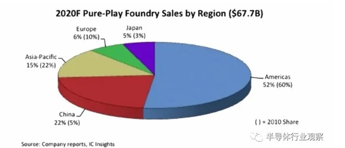 2020年度纯晶圆代工各地区销售额占比,括号内为2010年占比(图源:IC Insights)
