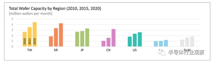2010年、2015年、2020年全球各地区晶圆产能分布情况(图源:SNV)