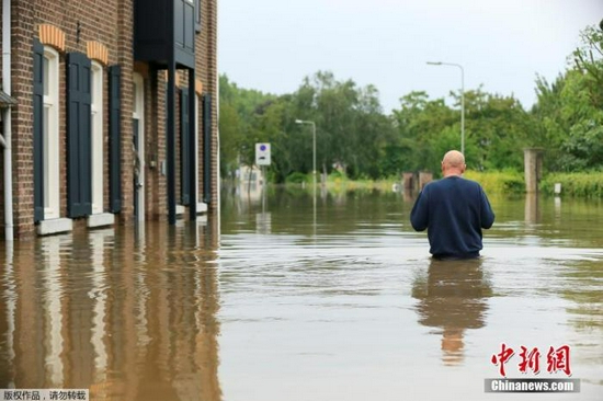 当地时间7月16日,荷兰Guelle,居民在洪水中涉水前进。