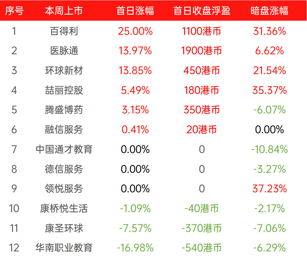 本周共十二只新股挂牌上市,其中豪车经销商-百得利首日暴涨25%,另外录得63万人认购的互联网医疗平台-医脉通首日大涨近14%,一手账面浮盈达1900港币。