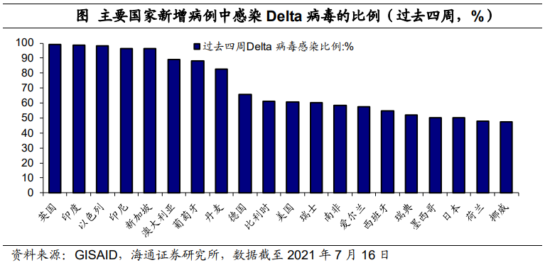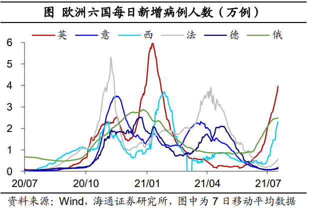 近期欧洲主要国家疫情均有所反弹,尤其是英国单日新增病例突破5万例(7月16日),为1月以来新高。近期海外疫情的持续恶化,主要与德尔塔变异病毒持续扩散有关。