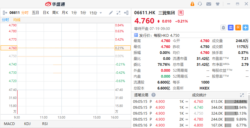 华盛资讯7月19日讯,地产开发商-三巽集团(06611.HK)首挂高开0.21%,报价4.76港币,当前成交额1175万港币,最新总市值超31亿港元。
