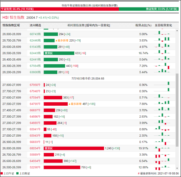 街货分布方面,上周五,恒指牛证街货贴价区间主要在收回价26500点至26900点之间,累计相当约2605张期指合约;恒指熊证街货在收回价28200点至28700点,累计相当约1931张期指合约。