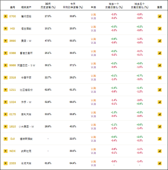 上周五恒指相关权证的平均引伸波幅报约20.5%。个股方面,比迪、吉利相关认购证的引伸波幅按日小幅调升;平安、阿里相关认沽证的引伸波幅则按日小幅调降。