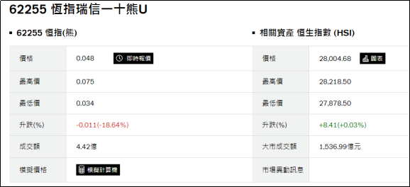 2、看错方向:恒指瑞信—十熊U(62255.HK),上周五下跌18.64%。