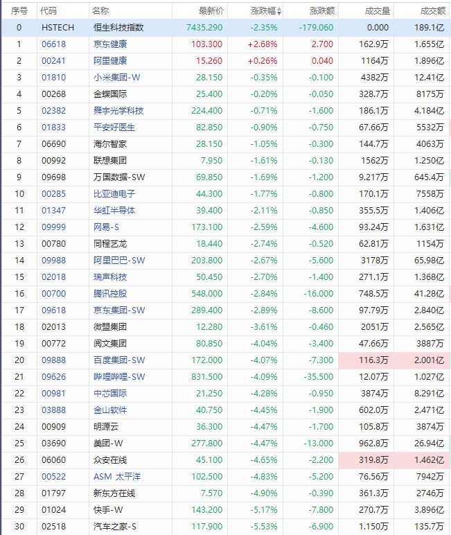 汽车之家-S跌5.53%;快手-W跌5.17%,创股价新低;新东方在线、ASM太平洋、美团-W、中芯国际、哔哩哔哩-SW、百度集团-SW等跌超4%。微盟集团跌超3%;京东集团-SW、腾讯控股、瑞声科技、阿里巴巴-SW等跌超2%。