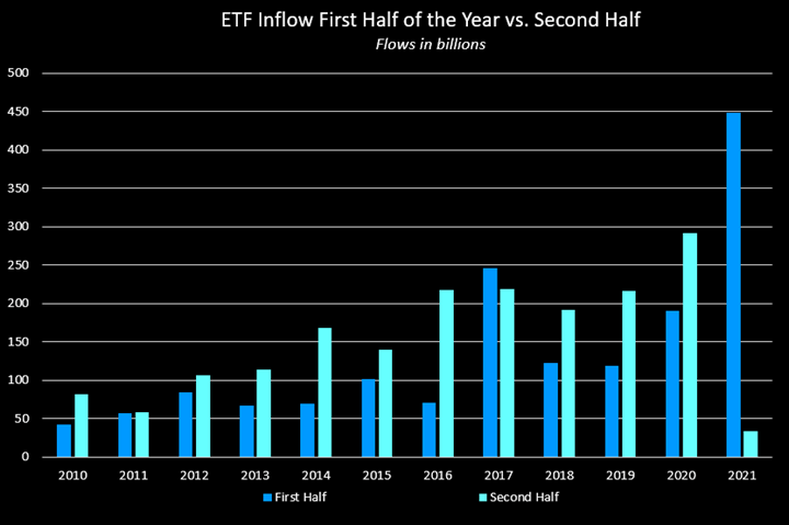 一些预测者认为,到今年年底有可能达到1万亿美元的纪录。从历史数据上看,下半年的ETF资金流入量一般比上半年更多。在过去的11年中,有10年里下半年的ETF资金流入量超过了上半年。