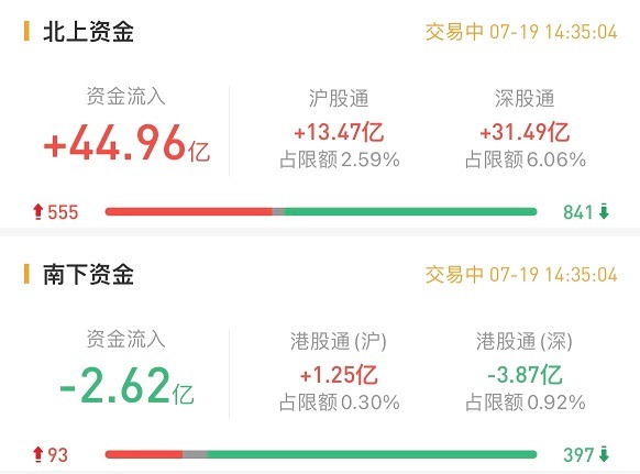 北上资金净流入44.96亿元。沪股通净买入13.47亿元,深股通净买入31.49亿元。